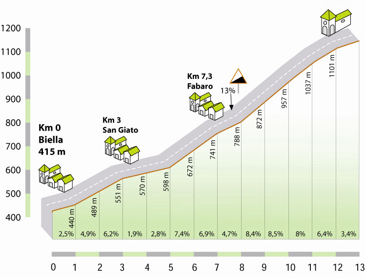El ascenso al Santuario de Oropa tiene una longitud de aproximadamente 11.8 kilómetros con un desnivel medio del 6%, alcanzando rampas de hasta el 13% en algunos tramos. El inicio del puerto es relativamente suave, pero a medida que se avanza, la pendiente se vuelve más pronunciada, especialmente en los últimos kilómetros, donde los ciclistas deben enfrentarse a una serie de curvas cerradas y una subida constante que pone a prueba su resistencia y habilidades de escalada.